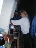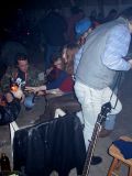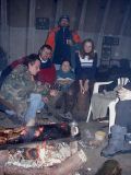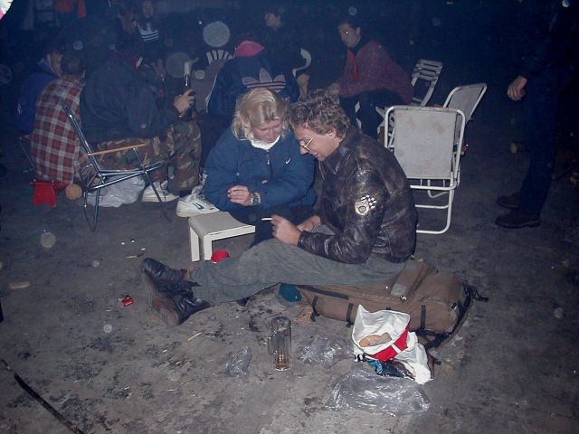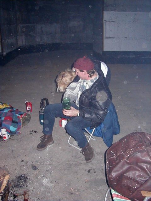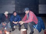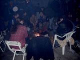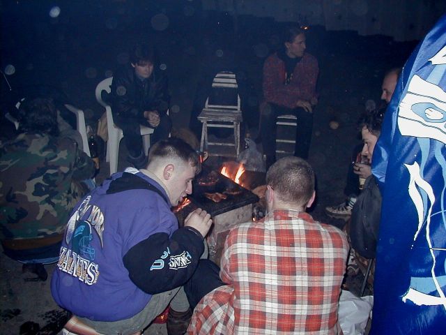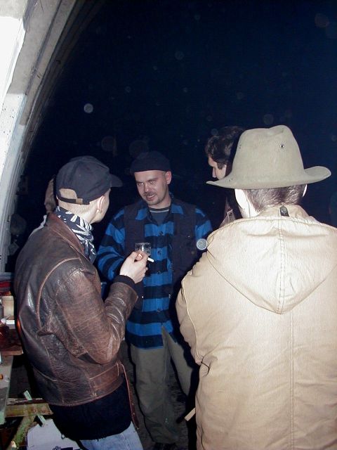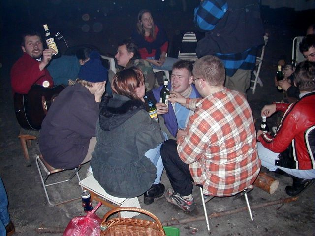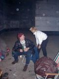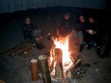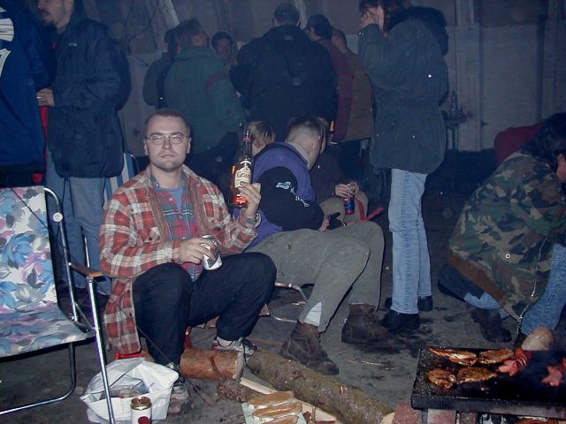 No pak se to vše odvíjelo standardním způsobem. Pivo, maso na grilu, pivo, atd ... Nejvíc se mi líbil Ranža s jeho pochodněma, Markétka s její Josefínkou (jako obvykle), Fík s jeho kulichem no a potom GAS. Ty bláho to je živel. Víděl jsem ho na vlastní voči poprvé a jsem rád, protože i kdyby už nikdy, můžu o něm vyprávět sým vnoučatům :-))) Seděli jsme u ohně, naproti někdo šmudlal na kytaru, kdosi k tomu vyl, na zemi pobíhala nějaká šlechtěná čuba, která se dala ochočit chlebem. Jediným problémem byl malý kuchyňský kout - teda to prkno o stěny, kam se rozhodně nemohlo vejít všechno žrádlo co tam všichni s sebou měli. Tak jsem se rozhodl jít příkladem a svoji papundeklovou bedýnku strčil pod ten "stůl". To byl dost blbej nápad, protože když jsem do ní asi za hodinu šel pro další várku masa, zjistil že je v ní o dost víc věcí než tam bylo původně. No a žádnách z těch nových věcí teda nebylo nic moc extra ... Fík na mě koukal jak se v tom hrabu a říká - "to je tvoje bedna? Já myslel že to je na vodpadky ...". Humusáci hnusný ....