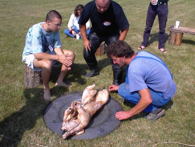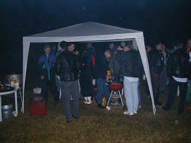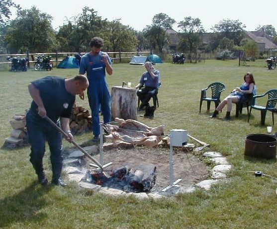 Kde sem to skončil - jo chladírna. Pak málem upadlo prase do ohně. Teda upadly takový ty držáčky co to prase drží u rožně, aby se moc nad tím ohněm nemrskalo. To spravili ti místní maníci, takže OK. Spravili to tak, že to i s prasetem navařili zpátky. Škoda že to nikdo nevyfotil. O prase se staral (alespoň mi to celou dobu tvrdil) Jarda Honzajk - krátká noha. Chvilkama se mi to moc nezdálo, protože se neustále poflakoval někde jinde a na tom praseti naskovaly puchejře, jako když má lepru. Jarda ale tvrdil že je to OK, a tak jsem stáhl námitky. Vono taky, von když na vás koukne a řekne "problém ?", většina z nás odpoví "nee..eee.". Ne, teď vážně - Jardo díky. I těm ostatním co ti tam pomáhali.