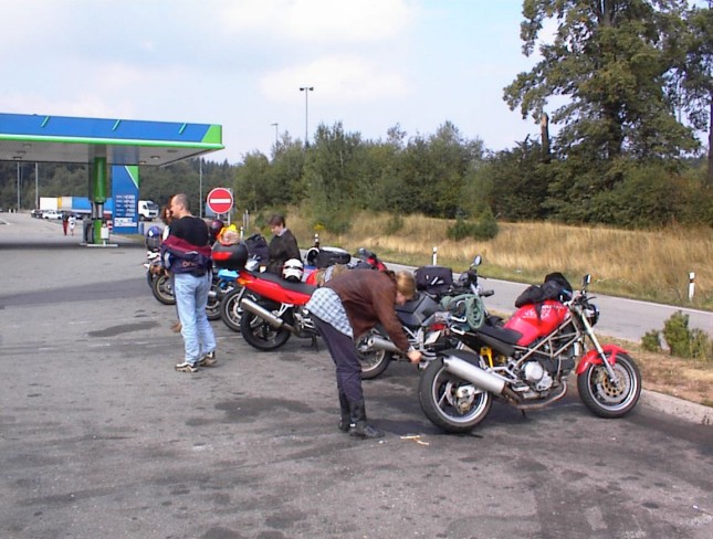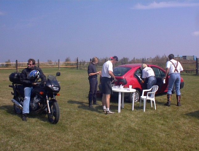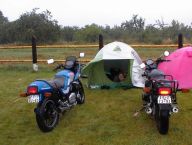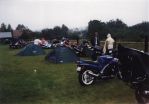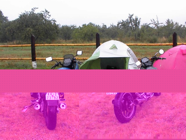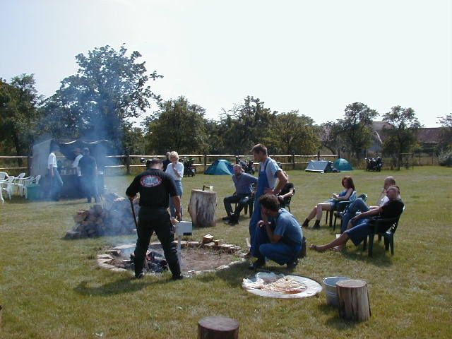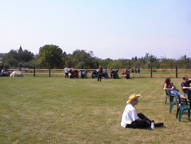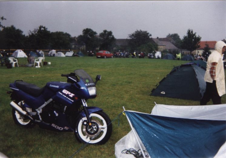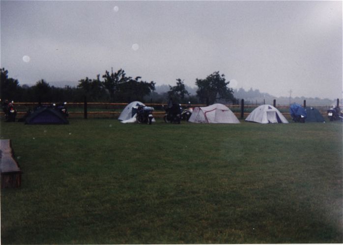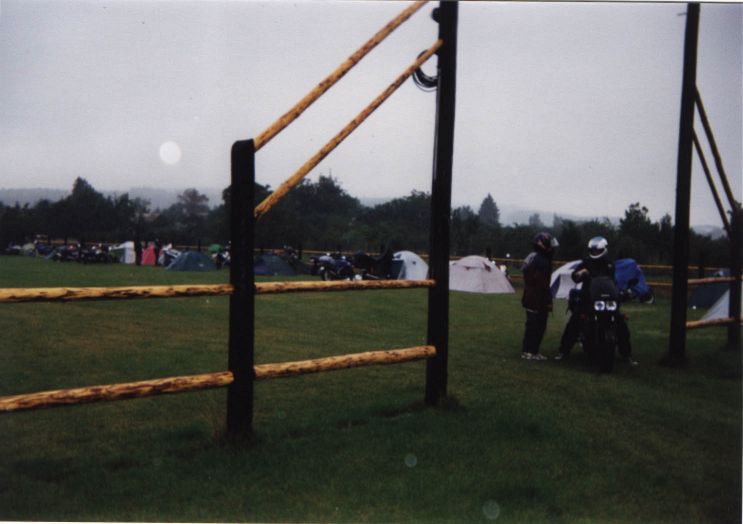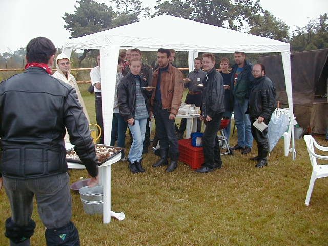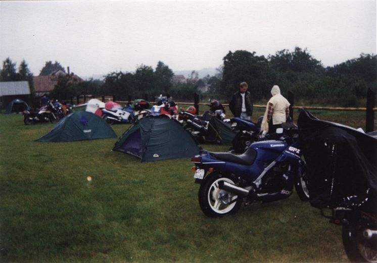 Vážně ten déšť byl hnusnej. Hnusnej proto, že byl mokrej, hnusnej proto, že se celá společnost rozpadne na skupinky, který se poschovávají kde se dá. Blbě se to pak vrací. Zkušenost na příští akci říká - těch velkejch party stanů musí být víc - takovejch 5 by to tady řešilo v pohodě. Kvůli dešti jsme se taky přestěhovali na chvíli dovnitř do hospody, z ní pak zase zpátky když nepršelo, pak zase začalo pršet a to už bylo fuk. Většina lidí ale vypadala, že jim to až zas tak moc nevadí - tlačili se na sebe pod stanem a vypadali happy. Na druhou stranu proč ne - grilovalo se tam maso - to maso byl dost dobrej napad. Možná se měli líp než ti co seděli v hospodě a nechali se prudit těma pinklama. Nechápu, nerozumím, ale pinklové prováděli věci co se dít neměly. Postbolševické trauma ? Když sem o tom mluvil s majitelem, koukal jak zjara. Já bych to viděl tak - ty dámy se celý měsíc těšily že přijedou motorkáři. Z pověstí co jdou po veřejnosti dozajista očekávaly nejhorší - divoká pitka, následuje trhání šatů a znásilnění na stole atpod. Možná, že zrušily dovolenou s Fischerem u moře, jen aby byly v hospodě až to praskne. A výsledek ? Chovali jste se jak skupina anglických gentlemanů na výletě z Oxfordu do Cambridge. Tak mě napadá, že jsme je vážně moc zklamali. Hamba vám. Jen mi není jasný, proč byl mrzutej ten kuchař ? Že by se taky .... no to snad ne. Asi nám zaviděl naše krásný motorky.