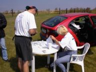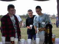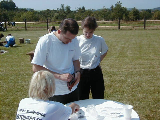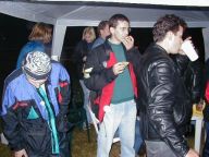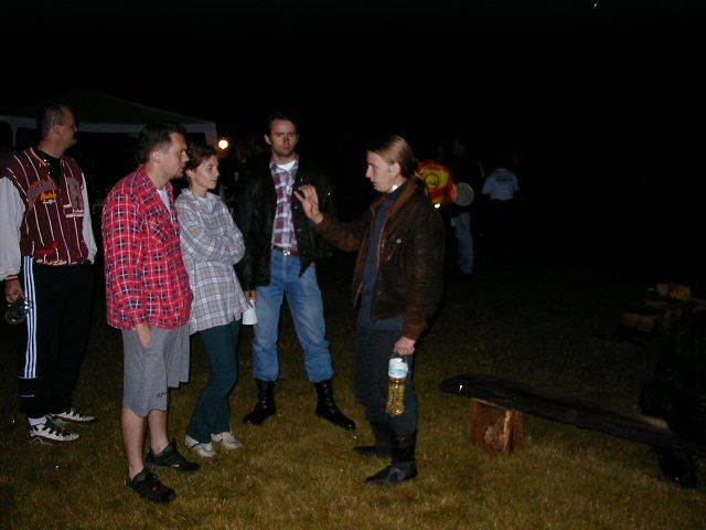 Mezitím se stále sjiždělo víc lidí. To už jsem přestával vnímat koho už jsem zdravil a koho ještě ne. Ještě že tam byla paní vrátná. Teda moje žena. Akorát mi přijde podezřelý proč ji všichni tak chválíte a pozdravujete .... No nic. Počasí se prasilo a prasilo a začalo pršet. Déšť byl na týhletý akci zlomovej bod. Přišel jsem tam o strašně moc iluzí. Mé osobní vzory, jejichž jména jsem šeptal ze spaní a o kterých jsem slyšel vyprávět legendy, se ukázaly jako ... no takový divní - Filip Martinez prchl do hospody po upadnutí prvních 12 kapek deště a odmítl se odtud vzdálit až do konce akce a Jirka Bašný - srdce mi usedá, když to píšu - zalezl pod stan a měl divný řeči na adresu pořadatelů :-)